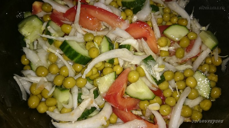 Салат из пекинской капусты, свежих овощей и горошка.