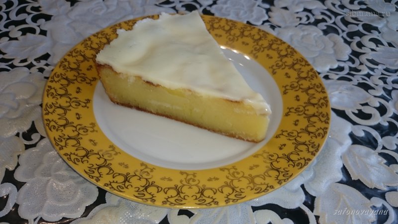Сметану взбить с сахаром. Горячий пирог достать из формы и залить сметанным кремом, поставить в выключенную духовку на несколько минут. Вынуть пирог из духовки снова полить кремом, разровнять лопаткой и поставить на 2 минуты. Достать пирог из духовки и покрыть кремом третий раз. Дать остыть и настояться.
