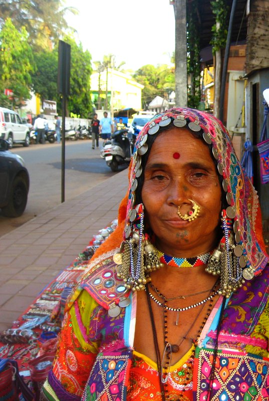 На улице она сидит в таком праздничном виде, продает местные сувениры, а после работы накидывает поверх всего этого "великолепия" простенькое сари, этими булавками скрепляет полотно на шее, и возвращается с работы скромная вся такая. Переодеваться некогда да и негде.