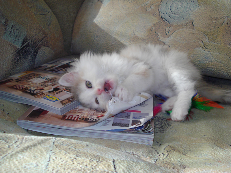 3. давно мечтала о белом коте...сотрудник (еще на совсем старой работе) повез кошку бежевую к белому коту...заказала если в помете будет белый кис с розовыми лапками и ушками - он мой.....так Максон у нас и появился