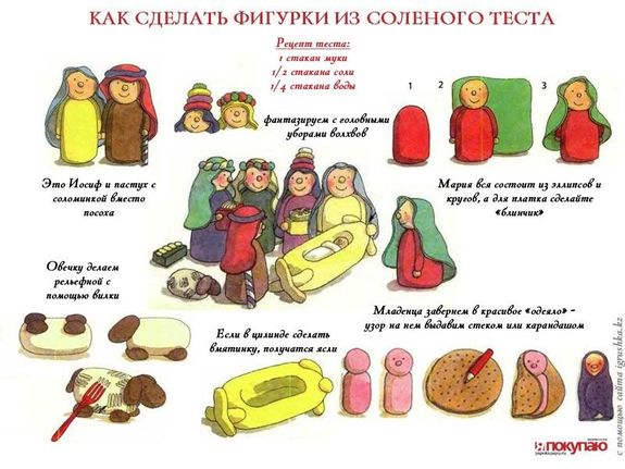 Можно слепить фигурки из пластилина, глины или соленого теста (оно высушивается при комнатной температуре или в минимально нагретой духовке до затвердевания, а затем раскрашивается любыми красками):