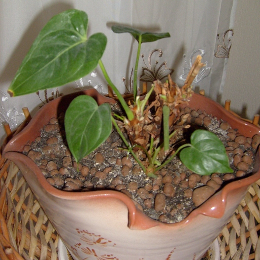 Я склоняюсь к тому, что у свекрови осталось более сильное растение, а детка тяжело переносит пересадку и новые условия. Антуриумы андре сложные растения, им больше оранжерея подходит, чем квартира. Сейчас весна, должен тронуться в рост.