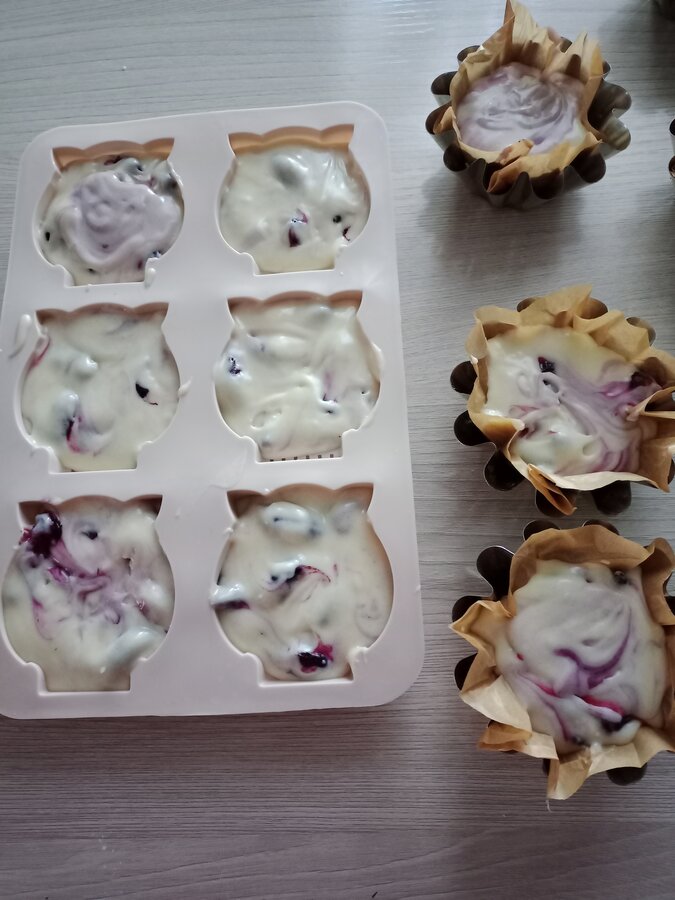 3. Формочки смазываю маслом, раскладываю в них тесто. Сегодня ещё положила в центр замороженную черешню