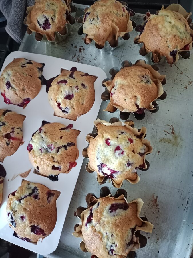 Маффины по рецепту Варвары Плюшкиной. Сделала сразу двойную порцию. С брусникой и штрейзельной крошкой.