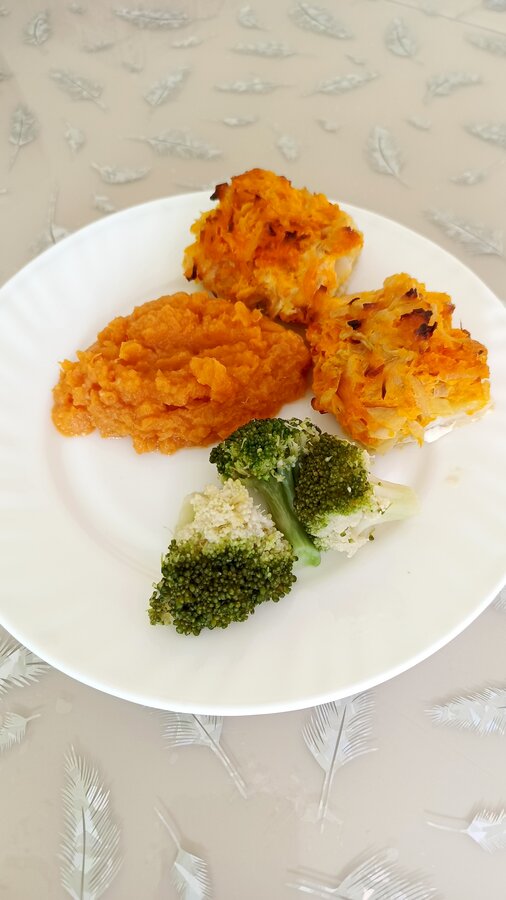 Минтай под луком с морковью, батат и брокколи
