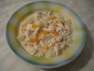 2. Картофель почистила, порезала, сложила в кастрюлю. Туда же добавила морковь, натертую на терке и куриное филе.