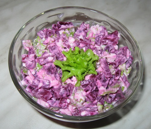 Свеклу нарезала соломкой, сыр натерла на терке, салат порезала. Все смешала, заправила сметаной. Необычное сочетание, но, поверьте, очень вкусное!