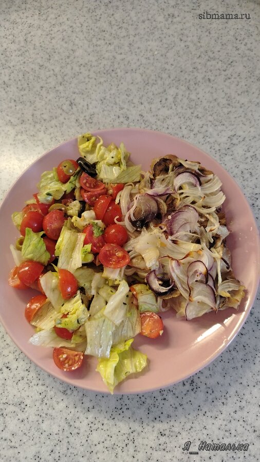 Салат и отбивная, запечённая в духовке под грибами и луком