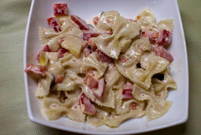и мое любимое блюдо из горячих макарон, то ли паста, то ли салат. Я тут уже его постила под названием Итальянский салат вроде бы давно, но много последних лет делаю только с домашним майонезом, совсем другой вкус