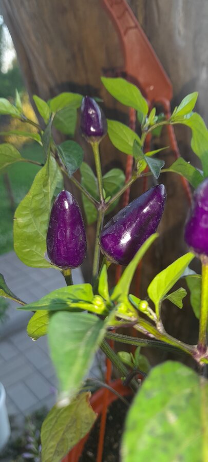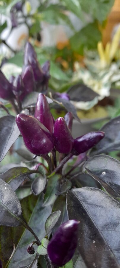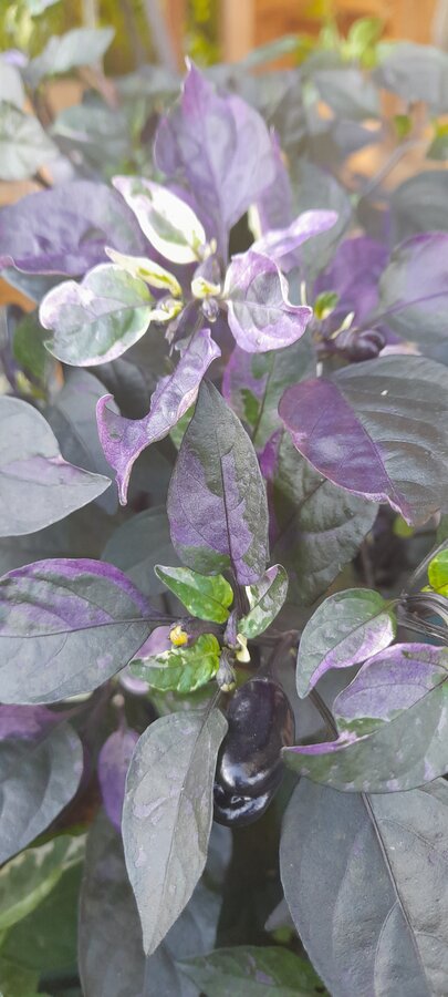 Привлекательный декоративно-съедобный сорт с фиолетово-синими стручками, при созревании меняющими цвет через желтый, оранжевый, в красный. Растения компактные, 30-45см в высоту, с великолепной тмено-фиолетовой листвой. Плоды конические, 1,5-2,5см в длину, в незрелом состоянии(синего цвета)- обжигающе острые, по мере созревания вкус становится более мягким