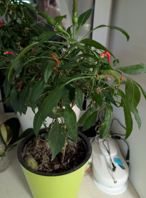 А это уже второй кустик от первого. Вино прокараулила, когда перчинка засохла и упала в горшок, проклюнулись несколько штук, распикировала и вот такая прелесть уже год в горшке.
