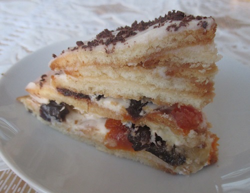 4. Сборка: лепешку обмакиваю в сметанный крем и выкладываю на блюдо. Прослаиваю нарезанным бананом, черносливом и курагой. Даю настояться.