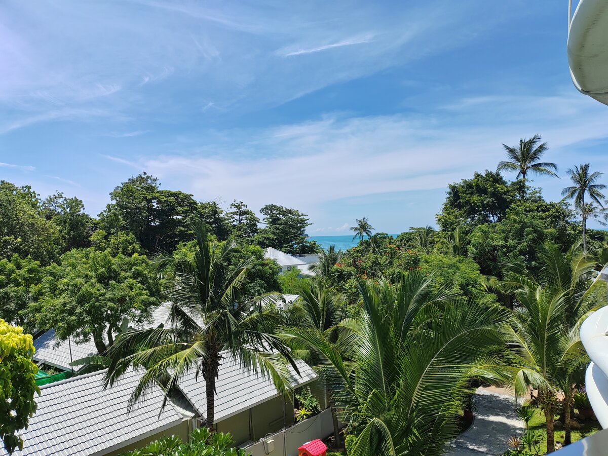 5 км от аэропорта, не слышно самолёты, ну может раз в сутки какой то. Мы в центре пляжа чавенг, минут 10 ходьбы до самого крупного ТЦ на острове. Ну и соответственно тут очень много всего