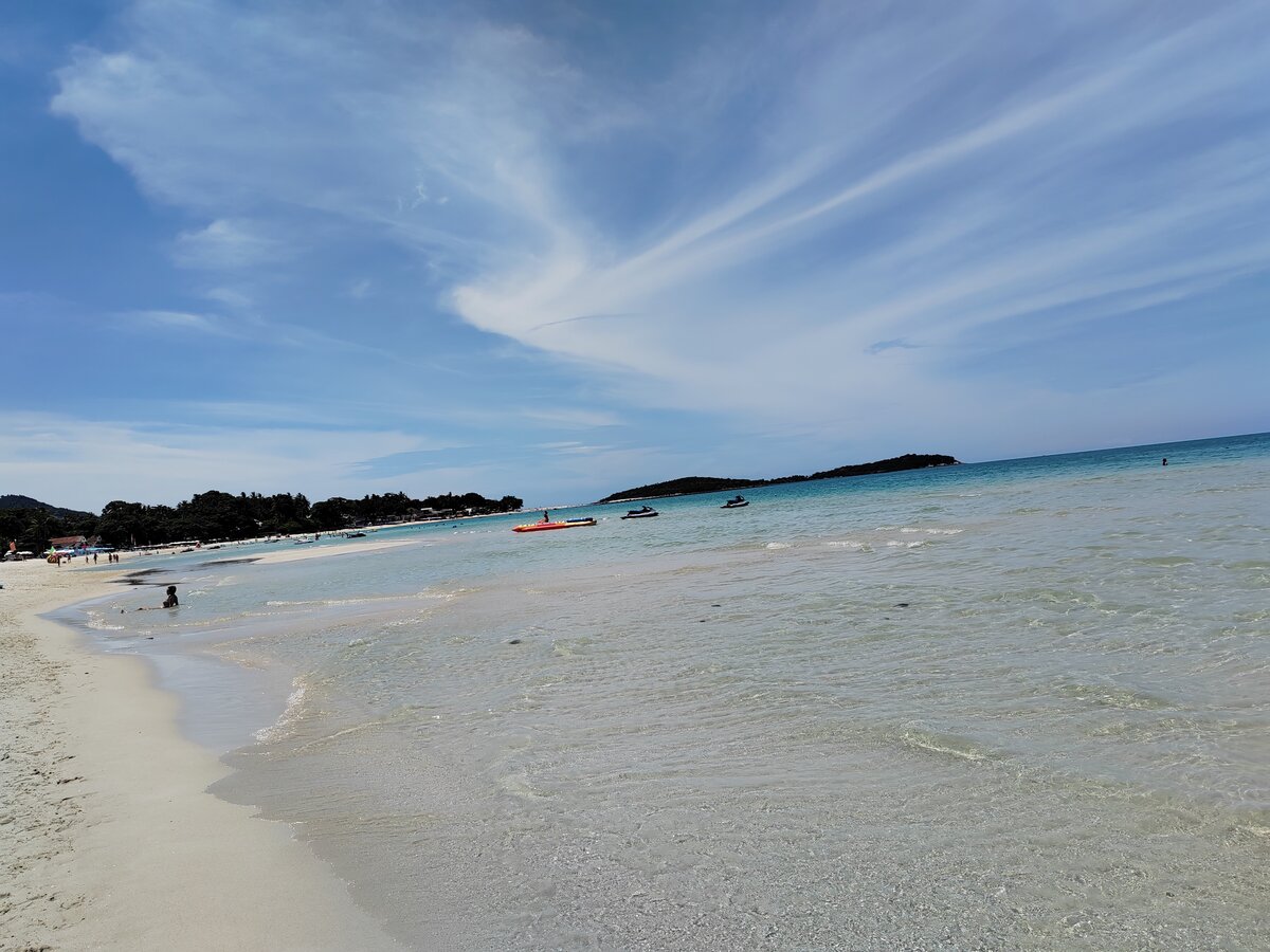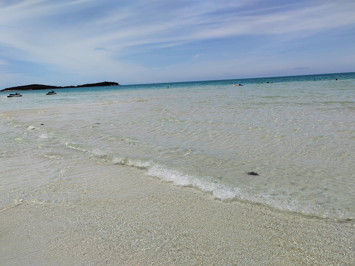 Песок говорят почти Мальдивский, белый мелкий, очень пологий заход, метров 5 по колено, потом глубина. Вода идеально чистая, как парное молоко прям, в 12 дня на мелководье наверное все 38 градусов, реально как в горячую ванну вход. На глубине градусов 30. Очень спокойная вода, я прри ветерке купалась в кепке и очках сегодня