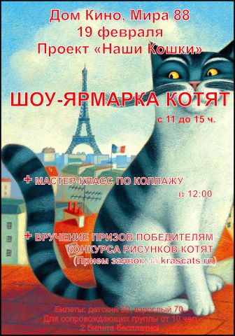 С 12 до 14 часов - мастер-класс по коллажу на тему котят с участием зрителей. Финал конкурса детских рисунков - заходите на форум о кошках krascats.ru. Мини-выставка детских поделок и слайд-шоу о кошках