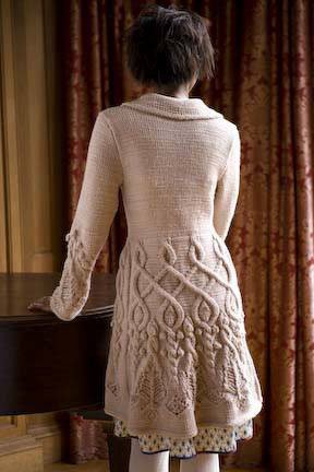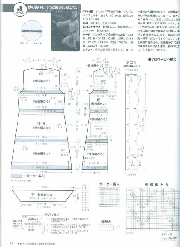 86(94) петли набрать и вязать изнаночный ряд: кром., 1 лиц. *2 изн. 2 лиц. * закончить с 2 изн. 1 лиц., кром. По схеме основного узора вязать дальше. На высоте 18(20) рядов средние 4 петли перекрестить - 2 петли на всп. спицу перед работой, 2 лиц. 2 лиц. со вспомог. спицы. В следующем ряду работу разделить в середине и обе части заканчивать отдельно. Для горловины в каждом 2 р. 15 раз убавить 1 п. Убавки делать, как описано выше. Оставшиеся 28(30) петель закрыть, при этом возможно сразу прикеттлевать части, связанные крючком. На 1 пико- 1 лицевая ребра основного узора.