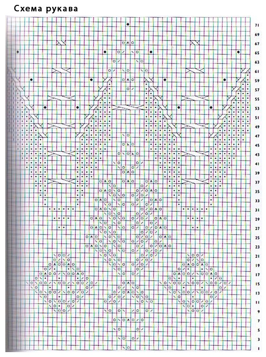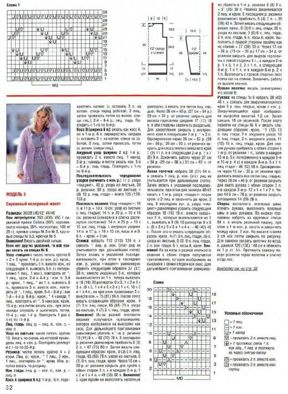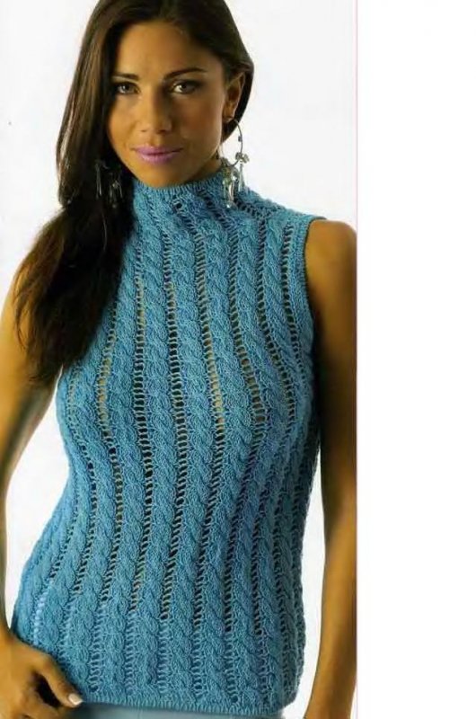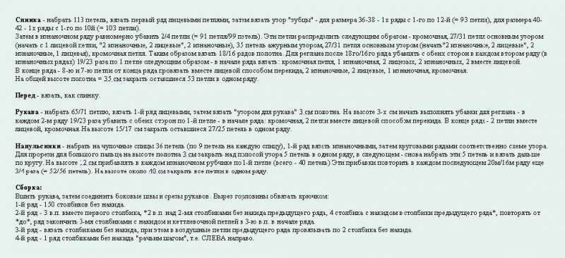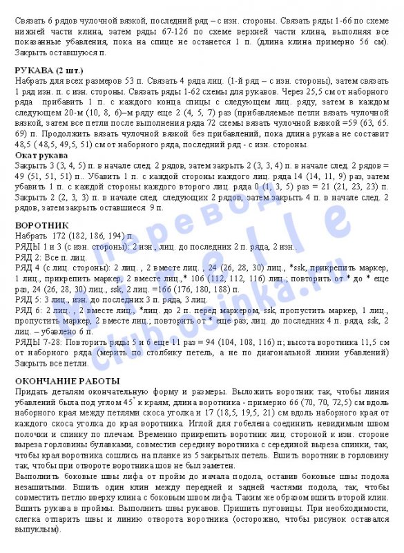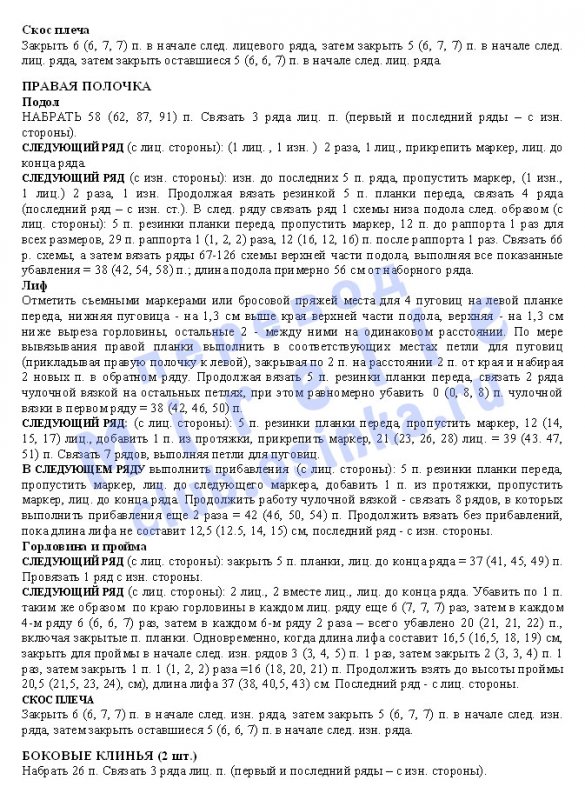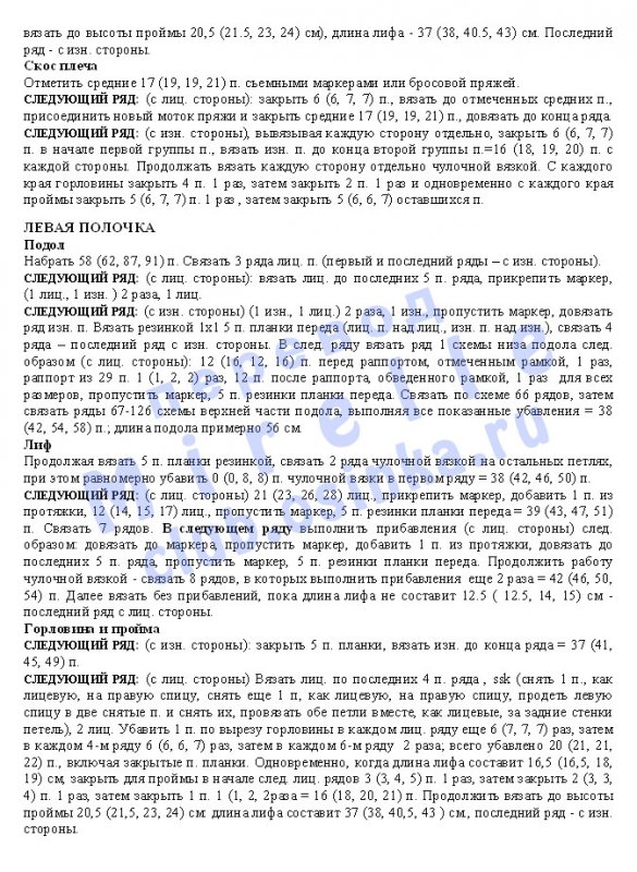 набрать 86(94) петли и вязать изнаночный ряд: кром., 1 лиц. *2 изн. 2 лиц. * закончить с 2 изн. 1 лиц., кром. По схеме основного узора вязать дальше. Для пройм на высоте 34 см - по высоте спинки - убавить с обоих сторон 1 раз 3 пет. потом в каждом 2м ряду 6 раз 1 пет. Убавки делать, как описано выше.= 68(76) пет. После убавок первые 2 и последние 2 петли ряда вязать лиц. Для выреза горловины на высоте 48(50)см закрыть средние 16 пет. и оба плеча вязать отдельно, убавляя в каждом 2 ряду 8 раз 1 п. На высоте 56 (58) см закрыть оставшиеся 18(22)п. плеча.