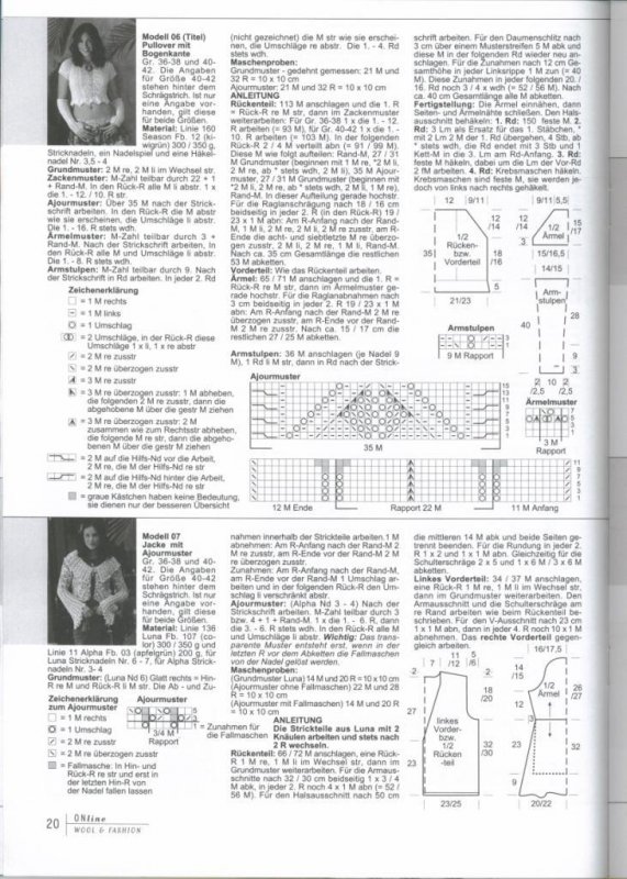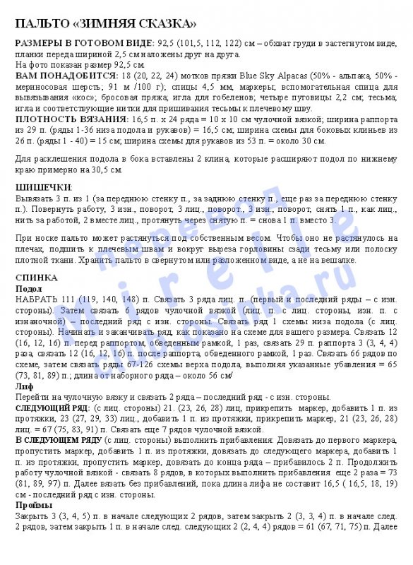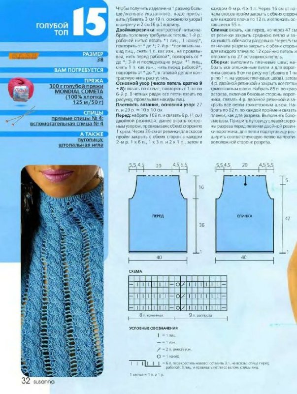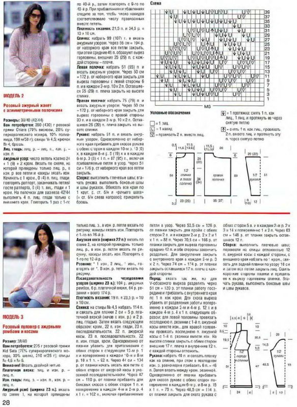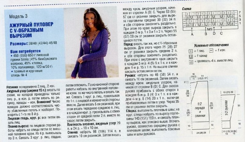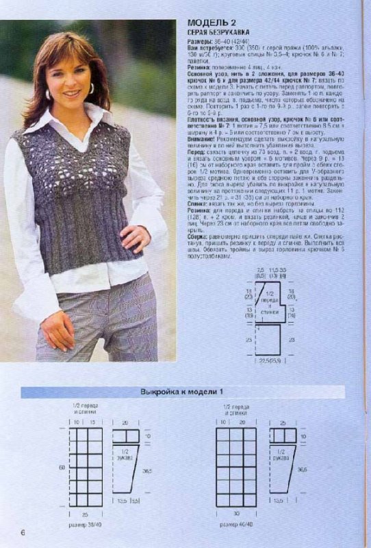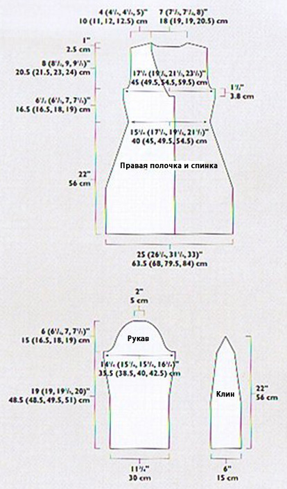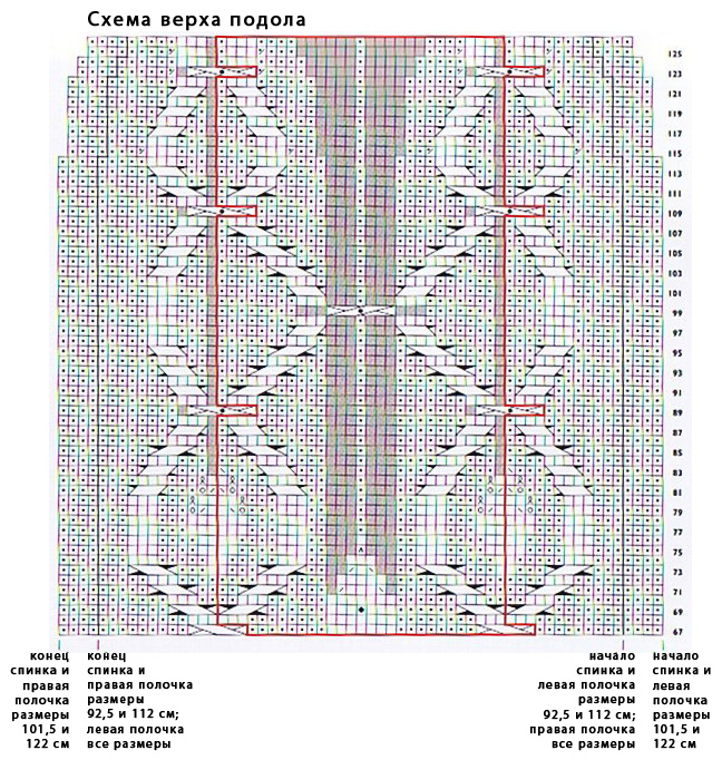 набрать 86(94) петли и вязать изнаночный ряд: кром., 1 лиц. *2 изн. 2 лиц. * закончить с 2 изн. 1 лиц., кром. По схеме основного узора вязать дальше. Для пройм на высоте 34 см - по высоте спинки - убавить с обоих сторон 1 раз 3 пет. потом в каждом 2м ряду 6 раз 1 пет. Убавки делать, как описано выше.= 68(76) пет. После убавок первые 2 и последние 2 петли ряда вязать лиц. Для выреза горловины на высоте 48(50)см закрыть средние 16 пет. и оба плеча вязать отдельно, убавляя в каждом 2 ряду 8 раз 1 п. На высоте 56 (58) см закрыть оставшиеся 18(22)п. плеча.