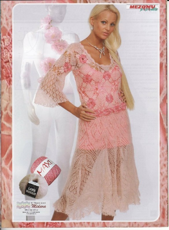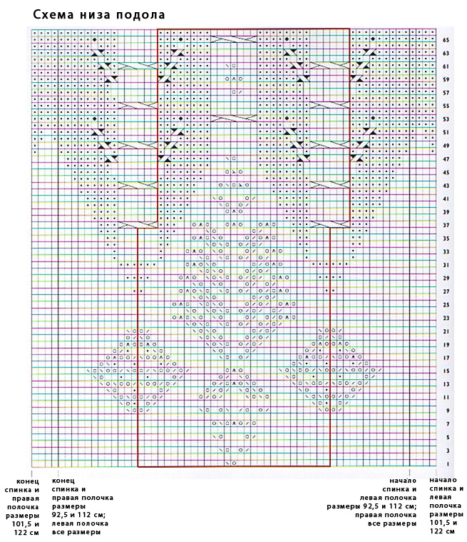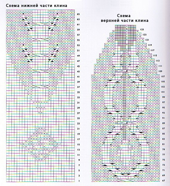 Набрать 14 воздушных петель и из 3 от крючка петли провязать первый столбик с накидом, вязать по схеме. Провязать 1-7 ряда, потом повторять только 6 и 7 ряды. После 31(33)рядов работу закончить 8-м рядом схемы. 2-ю часть связать также, при этом соединить обе части за 12-15 пико.