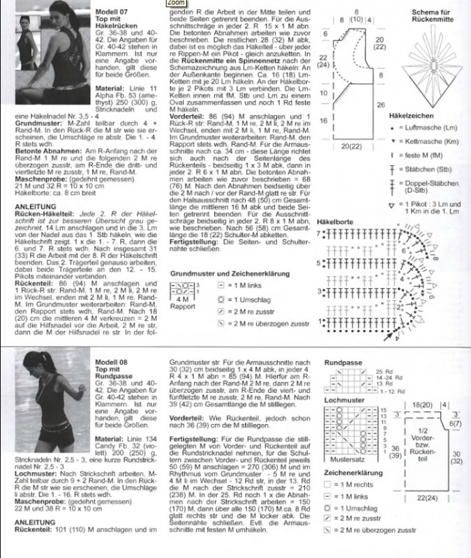 В середине спинки связать воздушными петлями сетку по схеме. Начать снаружи. Связать примерно 16(18) цепочек по 20 возд.пет. Пико на лямках соединять 3 возд.пет. Цепочки из возд.пет. соединить столбиками без накида, столб. с накидом и возд.пет. в овал и обвязать 1 рядом ст.без накида.