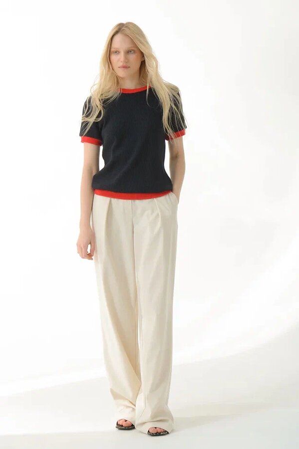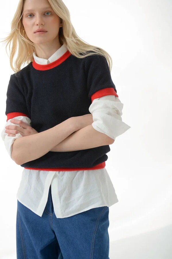 "Джемпер с коротким рукавом.Его легко сочетать с другими вещами и приятно носить. Выполнен из мягкого,обьемного трикотажа на основе вискозы.Акцент изделия - горловина, низ и рукава, обработаные трикотажем в красном оттенке. Длина изделия от плеча 56 см.