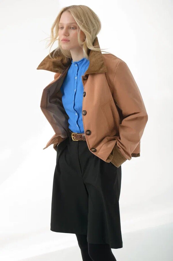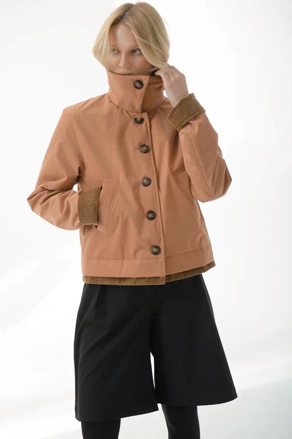 "Утепленная куртка в карамельном оттенке. Плотная верхняя ткань, с приятной велюровой текстурой хорошо держит форму.Благодаря пропитке, защитит от случайных осадков и ветра.Внутри - тонкий, невесомый, бельгийский утеплитель, идеально подходящий для весны и прохладного лета.Комфортная подкладка из поливискозы, внутренний функциональный карман.Высокий воротник можно зафиксировать пуговицей. Бархатистая текстура вельвета на воротнике,рукавах и по низу изделия добавляет выразительность.Длину рукава можно регулировать подворотом из вельвета.