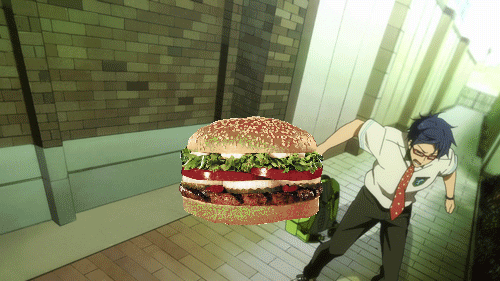 Рея (который на твоей гифке) покусал Кагами (здоровяк из Куробаса, который очень любит гамбургеры) - и теперь бедняга мутировал и вынужден гоняться за оными с безумным видом. Как зомби или оборотень.