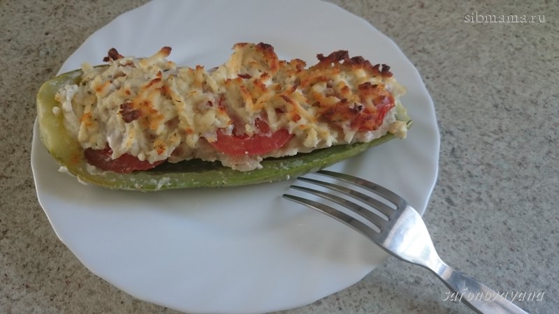 Лодочки из кабачка с куриным фаршем, помидоркой и адыгейским сыром в духовке.
