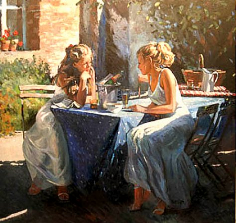 муж, который смотрит на женщину и любуется ею. Он не видит другую женщину в красной юбке, как будто она пытается обратить его внимание на себя. Сложно сказать что у мужчины есть любовница, кроме своей жены он никого не видит.