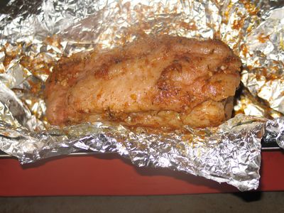 Кусок свиной шеи натирается солью и смесью специй, шпигуется чесноком. (У нас чеснок никто не ест, я обошлась без него). Мясо заворачивается в фольгу и убирается на ночь в холодильник.