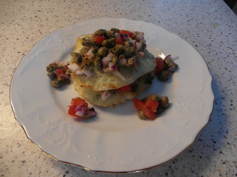 Сегодняшние драники с соусом из каперсов, помидоров и красного лука.