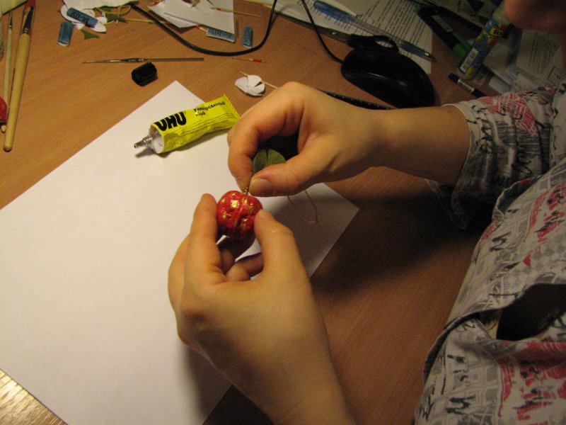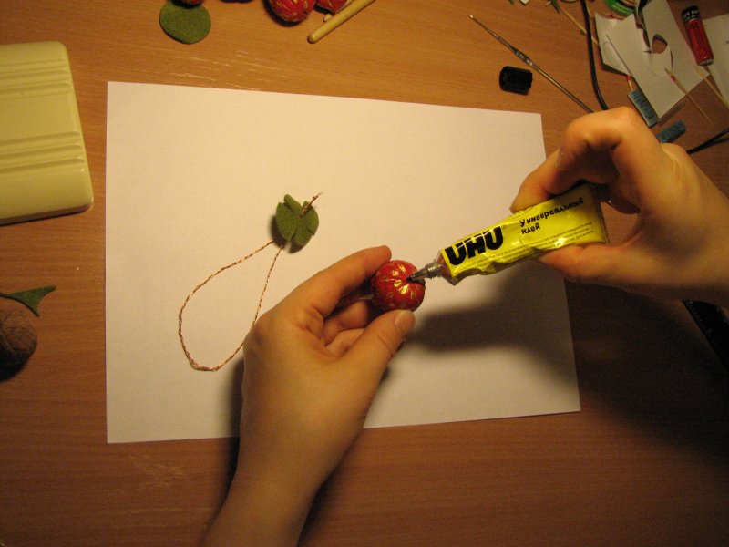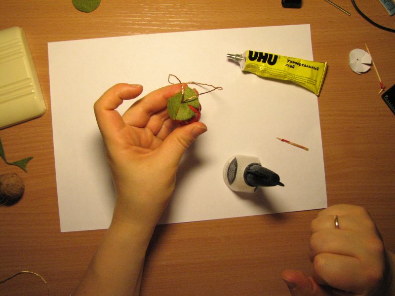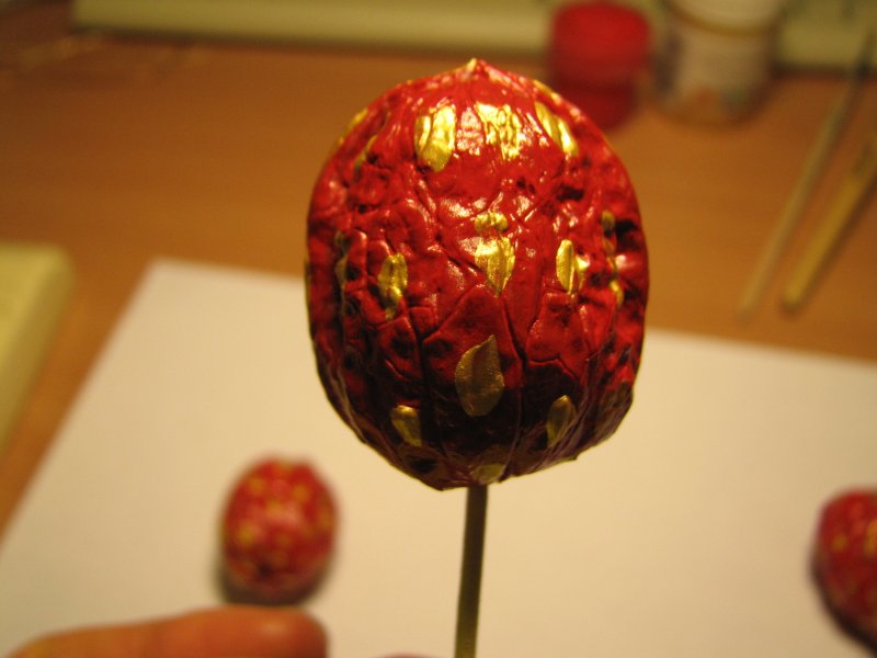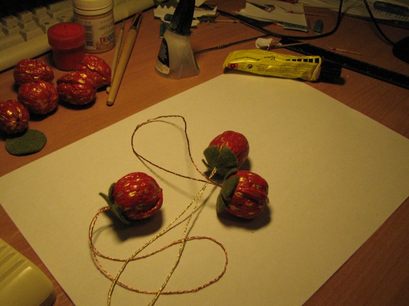 Мастерили в прошлом году со старшим сыном, но на фото к сожалению только я, а сынулик фотографировал :-) Незатейливо и очень просто в исполнении, может кому-то пригодится... Новогодняя клубничка из грецких орехов: