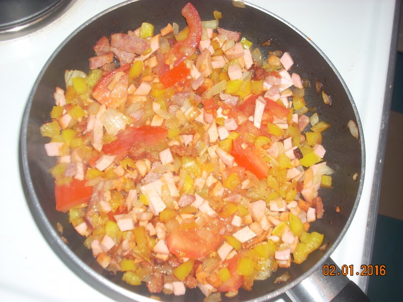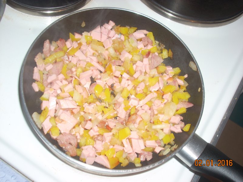 На сливочном масле обжарить лук, через несколько минут добавить нарезанный болгарский перец, ещё через несколько минут нарезанную колбасу, помидорки. Перемешать.