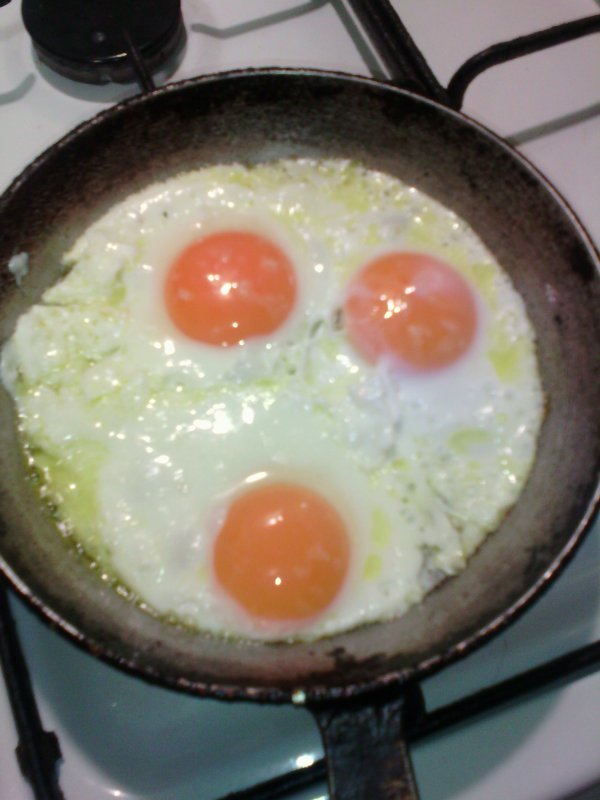 Просто яичница. Жарю всегда на этой старой сковороде на сливочном масле