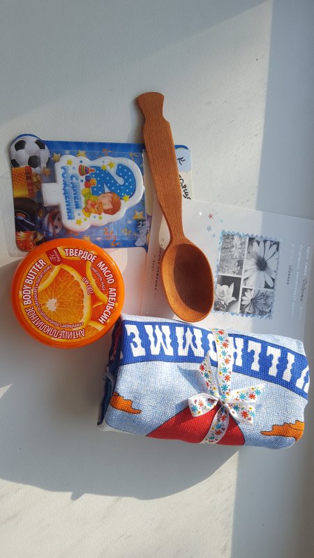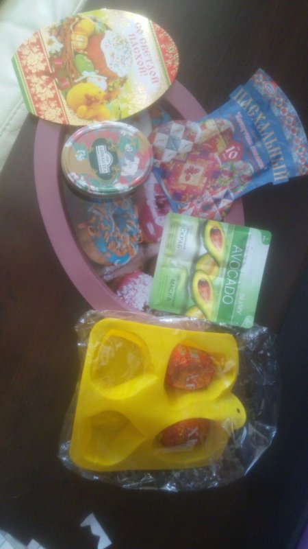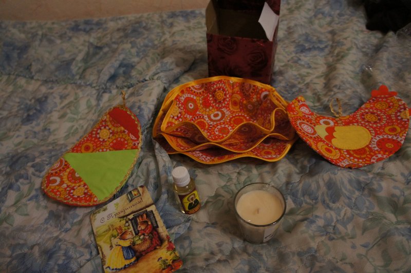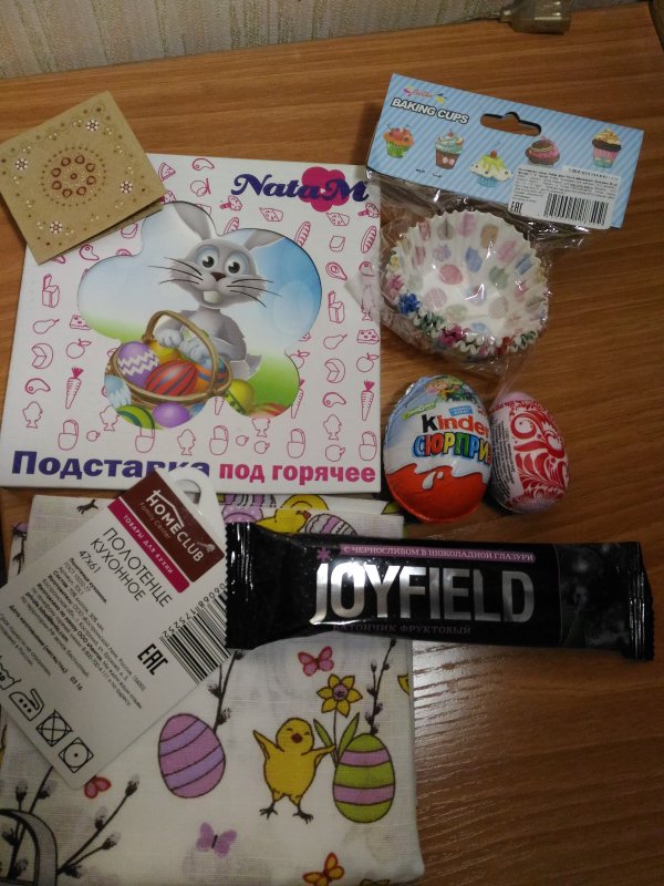 Мне очень понравился подарок, яйцо сын сразу съел, подставка под горячее замечательная, формы для кексиков обязательно использую, и полотенчико чудесное. Еще раз спасибо