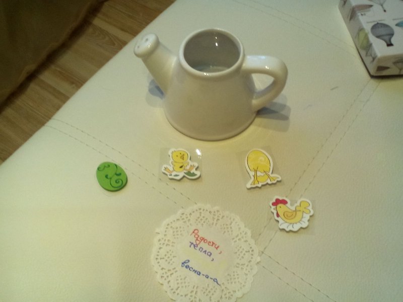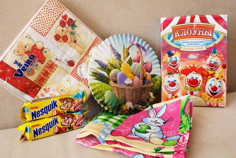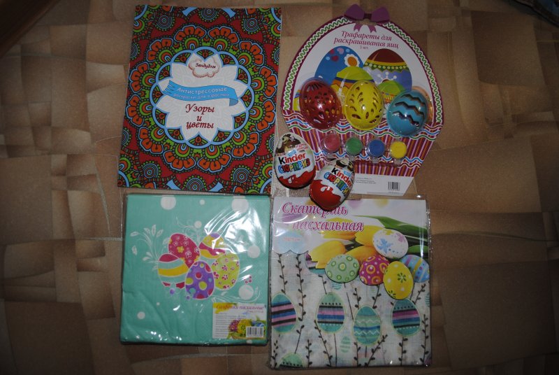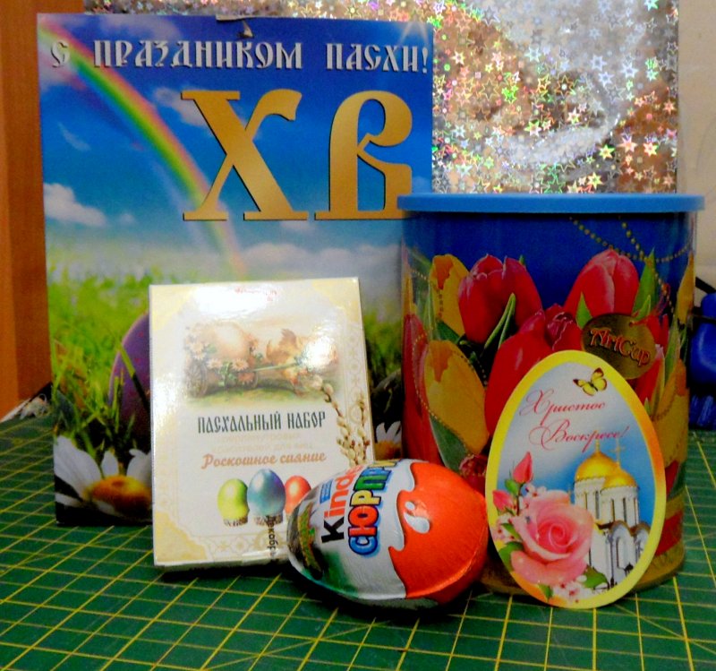 доска для разделывания в пасхальной тематике, наклейки для оформления, скатерочка пасхальная и чаёк и киндер - все просто изумительно!!