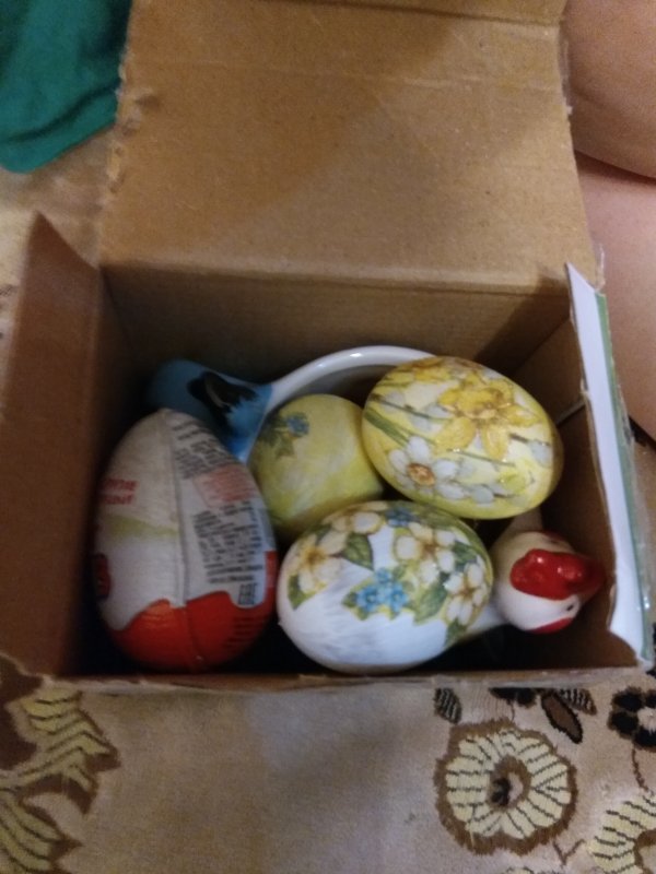 Спасибо большое пребольшое моему Пасхвльному кролику! Свой подарок я получила чуть больше недели назад, и он был так кстати! У меня тут что-то со всех сторон все грустно, и в тот день мы с ребенком оба в упадке зашли домой... Но ребенок все же ребёнок, отдохнув, он потребовал открыть кружку. Я сначала удивлялась, а потом увидела на коробке надпись про кружку... И она там правда была. )) Сын тут же составил натюрморт из всего пасхального и стал ждать пасхальную неделю, очень радовался, тем более что шоколадное яйцо сразу съел. )) И мне стало веселее, как лучик света была эта коробочка, все яркое, праздничное. )) Смешная крудко, полотенчико, термонаклейки (их тоже пустили в ход, но фото нет), шоколадные яички и очень красивые декупажные яйца. Яйца я особо заценила.