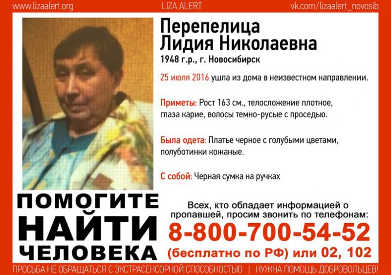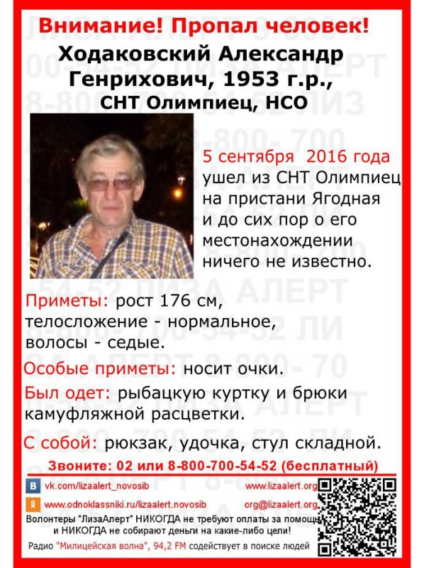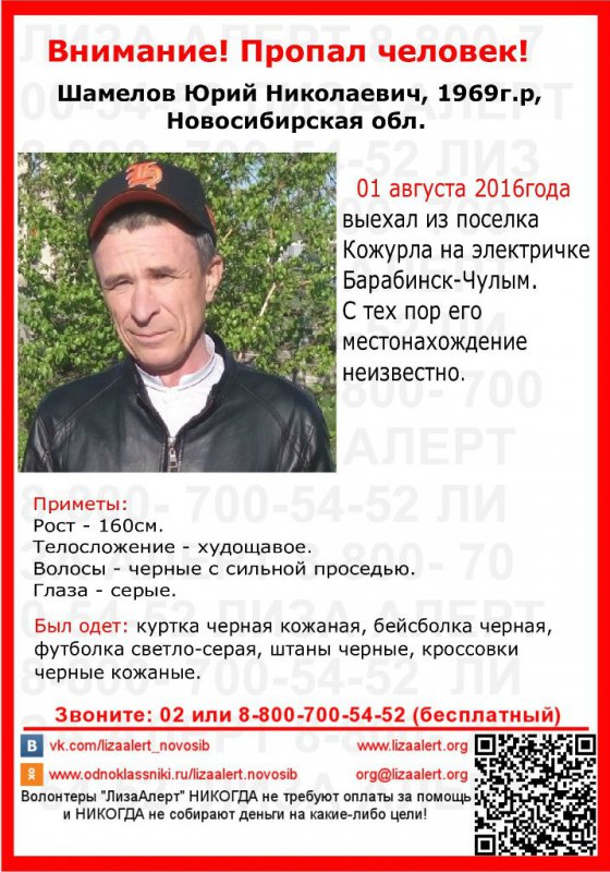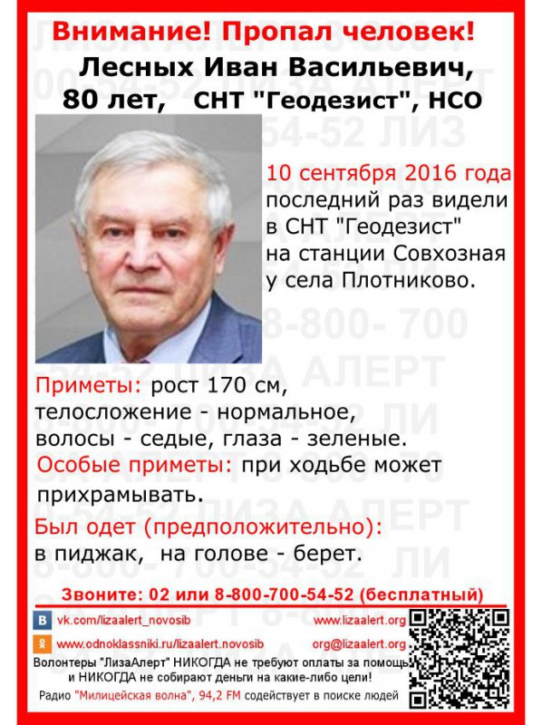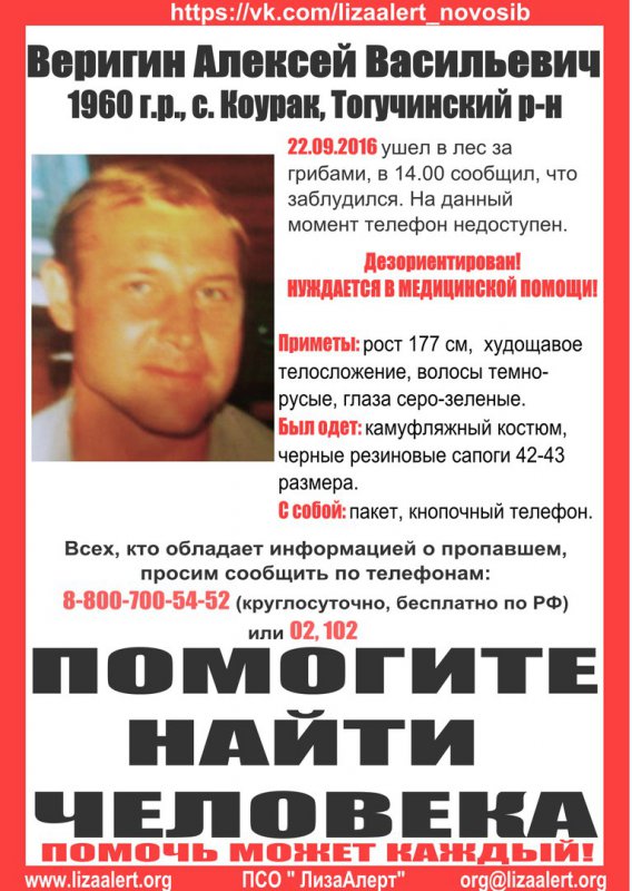 пропал близкий человек, звоните по БЕСПЛАТНОМУ номеру отряда 8 800 700 54 52. Официальная группа ВК "Лиза Алерт" vk.com/lizaalert_novosib