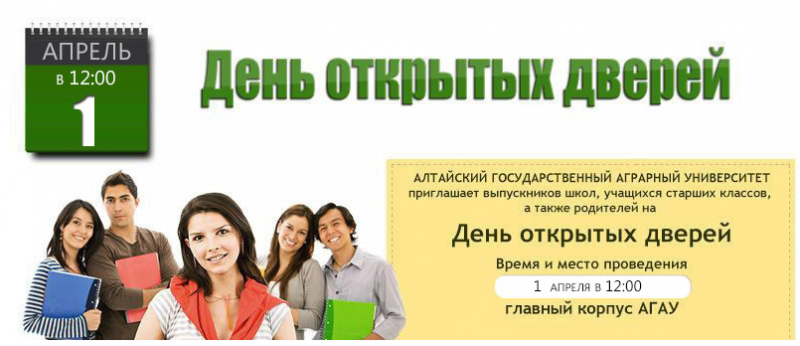 28 марта в Алтайском государственном университете начнётся Неделя открытых дверей. Расширение традиционного формата «открытых дверей» даёт возможность школьникам из городов и районов региона посетить вуз в любой удобный для них день. Неделя открытых дверей пройдёт по адресу: пр. Ленина, 61а. Обращаться следует в аудиторию 107 с 12:00 до 14:30.
