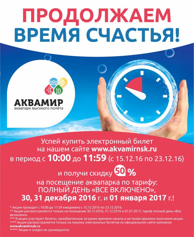 А мы 31го по акции сходили - полный день всё включено за полцены при покупке билетов на сайте в определенные дни в определенное время. Боялась какого-нибудь подвоха типа того, что сайт в это время висеть будет или какие-нибудь доплаты вылезут, но всё было четко, без сбоев и по-честному. Думали перед НГ пусто будет, ну куда там! :-) Приехали к 14 часам, очередей на входе уже практически не было, но аквапарк битком, правда пока мы в бассейнах поотмокали и в буфете протолкались, народ начал активно разъезжаться, а после 17 вообще свободно стало, и накатались вдоволь без очередей и битвы за плюшки :-) Здорово всё-таки там :in_love: Будем ловить следующую акцию :haha: