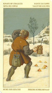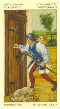 Молодой мужчина с приятным улыбчивым лицом стучится в дверь. У него легкий характер и хорошее чувство юмора. Наверное, он принес хорошие вести хозяевам. Одет он своеобразно, поверх легкой рубахи надеты доспехи, а на голове шлем. Доспехи положены рыцарю, а он пока только паж. Очевидно, это говорит о его твердой жизненной позиции, а так же о том, что он готов к обороне. Ну и конечно, о хорошей физической форме, ведь носить на себе латы, пешком не имея коня, не каждый может. Рядом с дверью на цветастой подушке лежит кошка с котятами. Эта кошка олицетворяет потенциал и жажду независимости молодого человека. На заднем плане домик, говорит о таких чертах как стабильность и надежность.