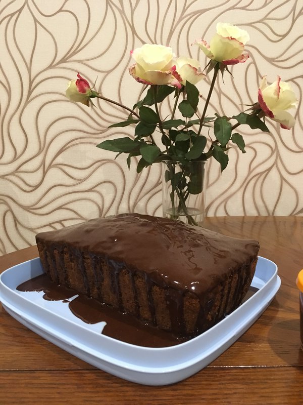 Готовый кекс выложила на решетку. Сверху полила растопленной с кусочком сливочного масла шоколадкой.