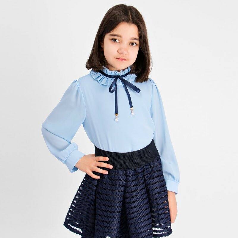 Шифоновая блузка с длинным рукавом для девочки. Ворот-стойка. На спине молния. Прекрасный выбор для школы или торжественного мероприятия.