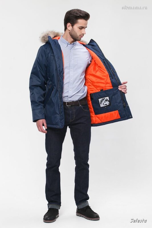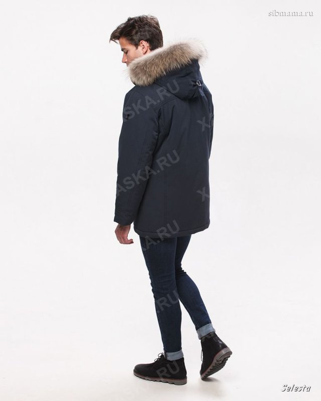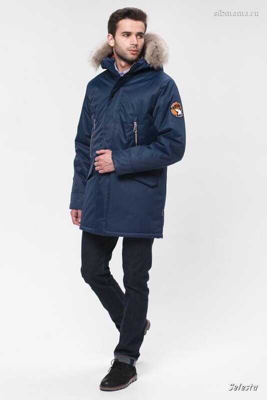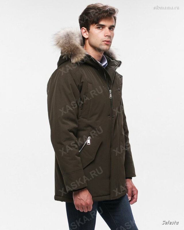 Несъемный капюшон с опушкой из енота финского (опушка отстегивается), центральная застежка на 1-замковую металлическую молнию, две ветрозащитные планки.