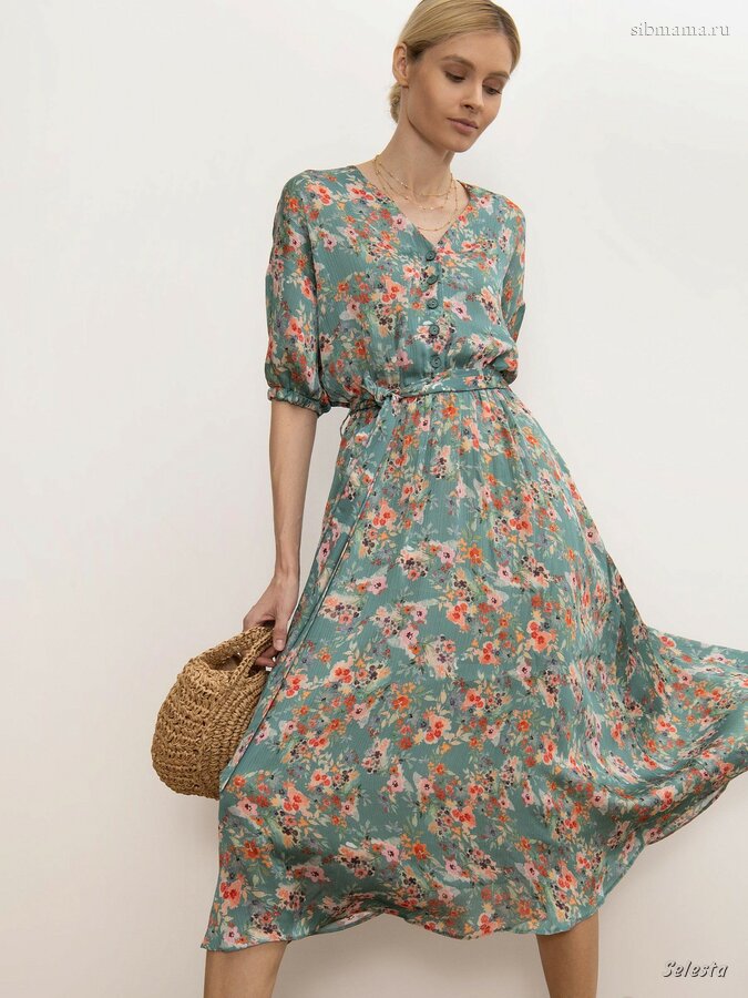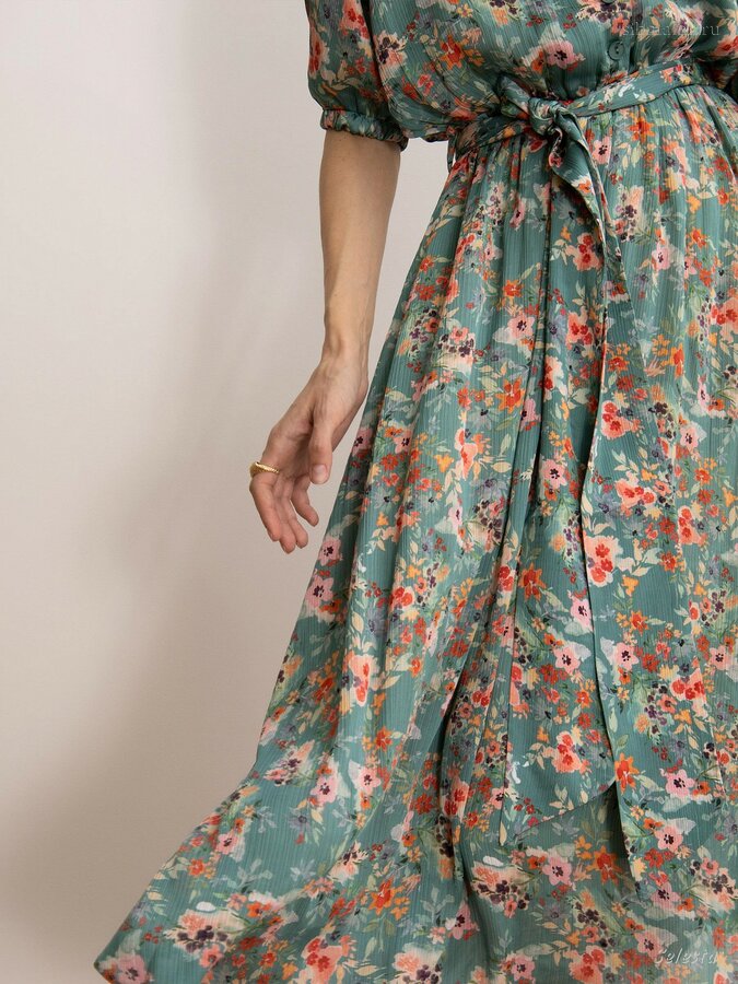 Изящное платье приталенного силуэта. Модель бирюзового оттенка усыпана ярким цветочным принтом.