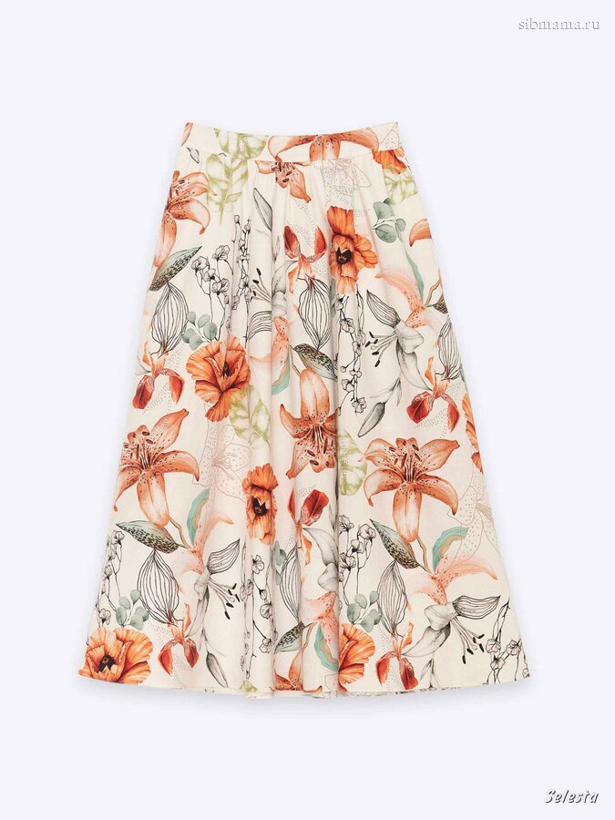 Яркая юбка А-силуэта молочного оттенка с красочным цветочным принтом.