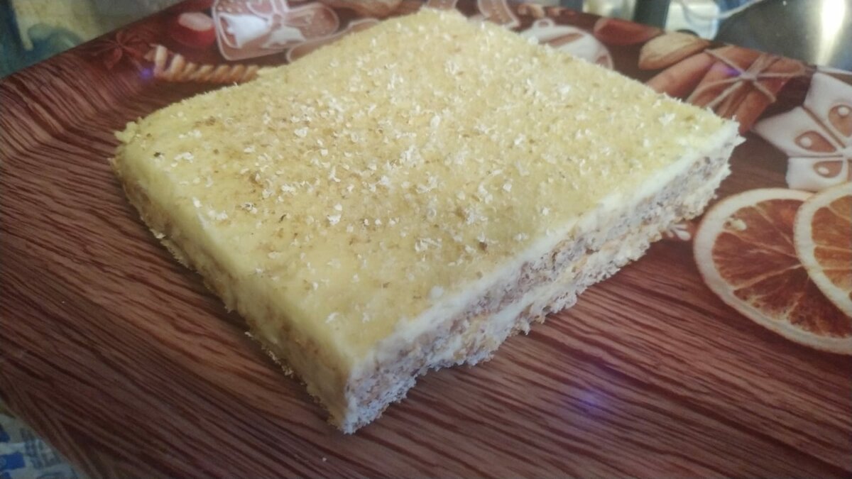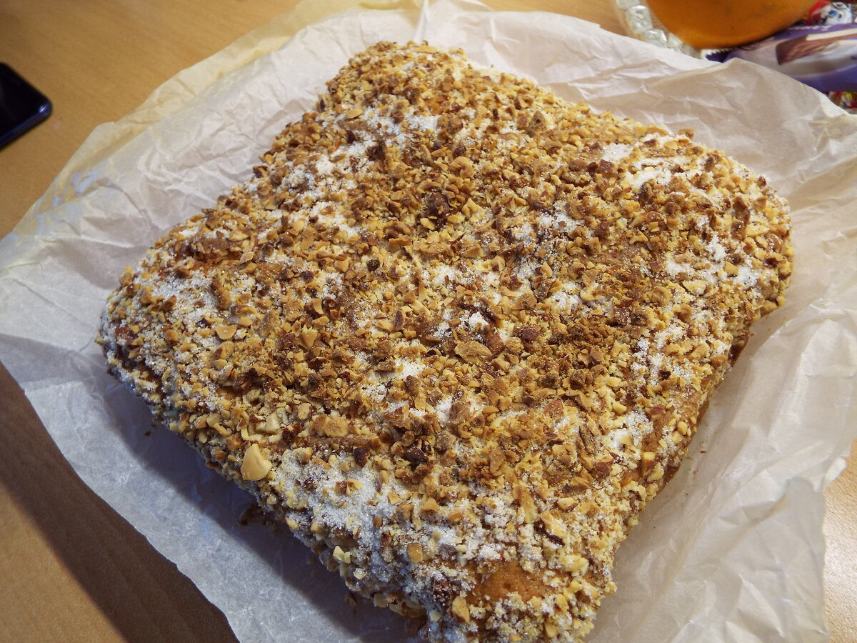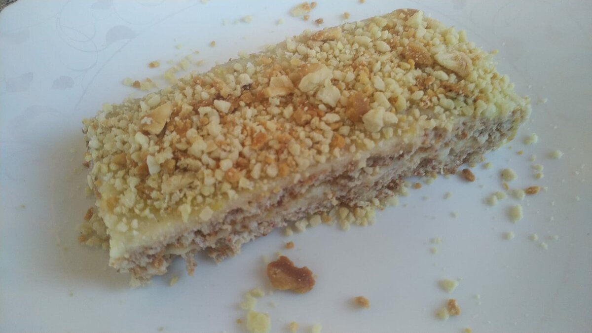Собираем торт (корж-крем-корж-крем, посыпка миндальные лепестки или крошка), оставляем на ночь в холодильнике. Торт можно заморозить.