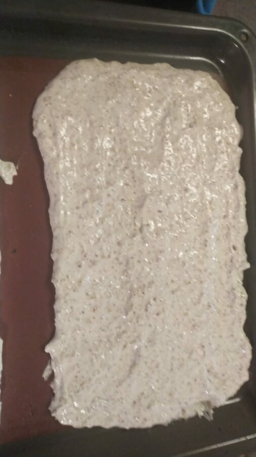 Я разложила тесто на 2 прямоугольника, сначала по очереди по одной ложке выкладывала вдоль каждой короткой стороны, чтобы разделить поровну, потом размазала по силиконовому коврику на 2 одинаковых прямоугольника. У меня они выпекались до золотистого чуть больше 10 минут.