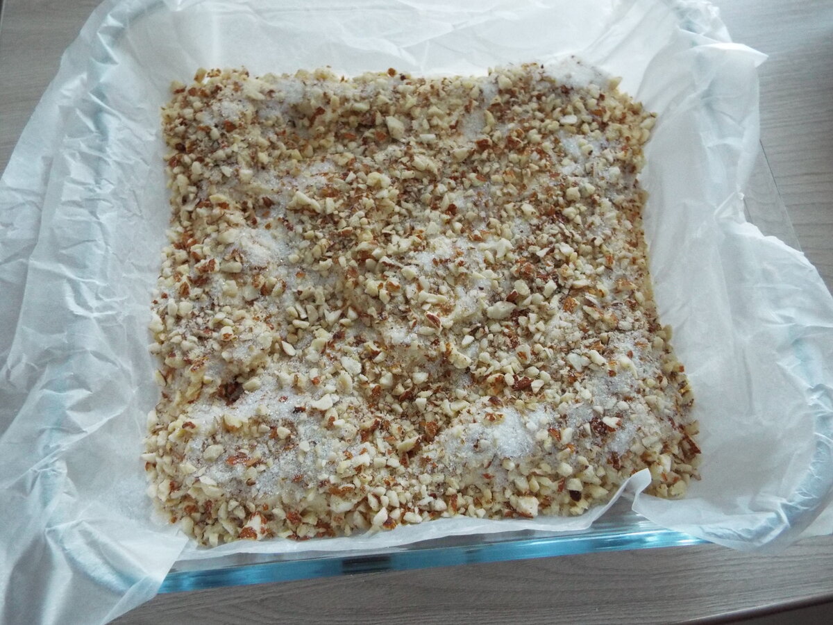 От себя скажу, что я в этот раз приготовила половину порции, мне хватило одной формы. И еще я побоялась соотношения миндаля к белковой массе после выпечки двух предыдущих коржей, в которых пропорции были 200 г на 4 белка и было нормальное тесто, я добавила на 1 корж из 4х белков еще 2 столовых ложки крахмала. Сахара для себя брала 40 грамм на корж.