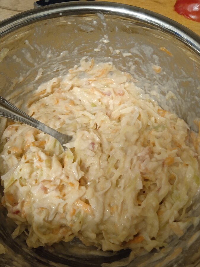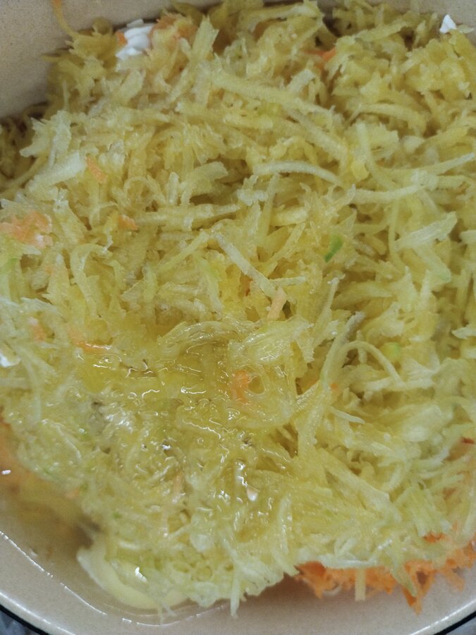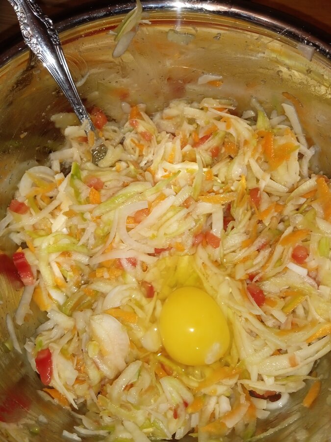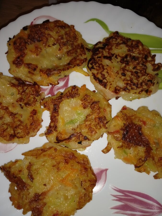 Кабачок (один маленький или половинка среднего), картофель (1-2 штуки), средняя морковь (1 штука), средний помидор (1 штука), одна небольшая луковица. Кабачок, картошкк и морковь натереть на крупной терке, лук и помидор мелко порезать. Посолить, дать постоять, лишний сок отжать (я люблю поохрустящее, поэтому сливаю сок). Добавить яйцо, муку до консистенции как на драники, соль, специи по вкусу. Обжарить с двух сторон.